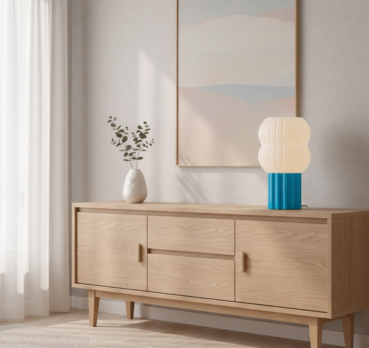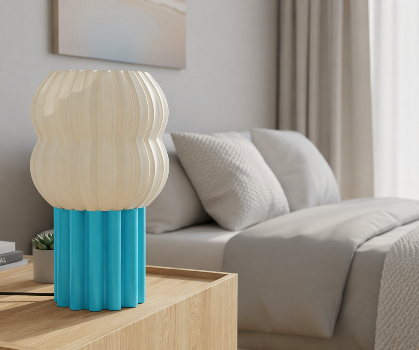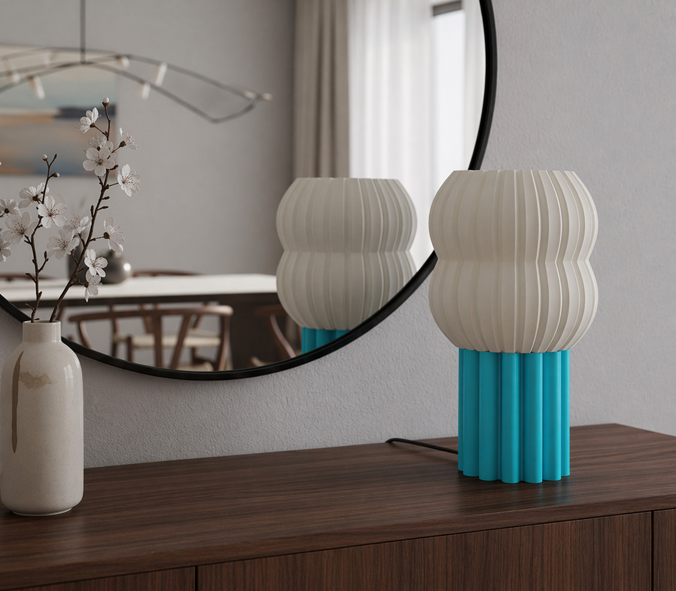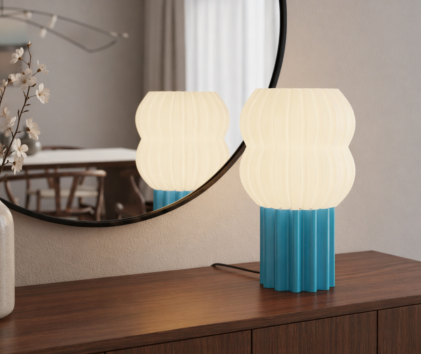 Bobla er en moderne bordlampe med myke former og et lekent, skandinavisk uttrykk. Den rillete hvite skjermen kombineres med en dekorativ fot i valgfri farge, noe som gir lampen et unikt og personlig preg. Bobla passer perfekt på nattbord, sidebord, kommode eller skrivebord, og tilfører rommet både stil og stemningsfull belysning.