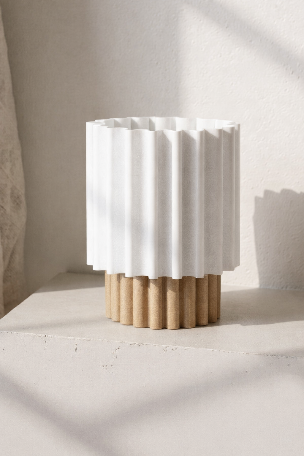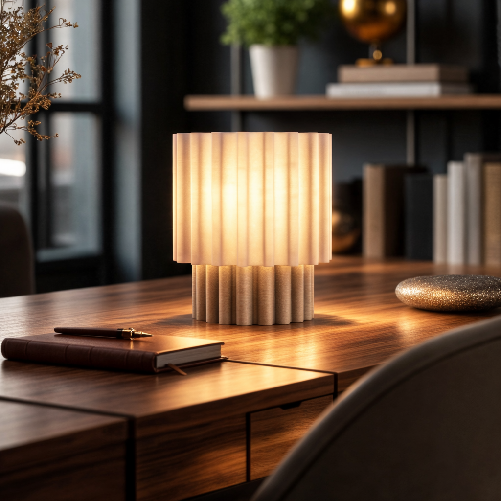 Denne moderne bordlampen kombinerer skandinavisk design, myke former og funksjonell belysning i ett unikt uttrykk. Med hvit rillet skjerm og valgfri fot i flere farger passer lampen perfekt på nattbord, sidebord, kommode eller i stuen. Lampen gir et varmt og behagelig lys som skaper en lun atmosfære i hjemmet. Den er 3D-printet i høykvalitets PLA+ plast og leveres med E27 sokkel og pære inkludert. Med sitt stilrene design er dette en dekorativ designlampe for deg som ønsker en moderne lampe med personlighet. Et flott valg for deg som vil kjøpe en unik bordlampe til stue, soverom eller kontor.