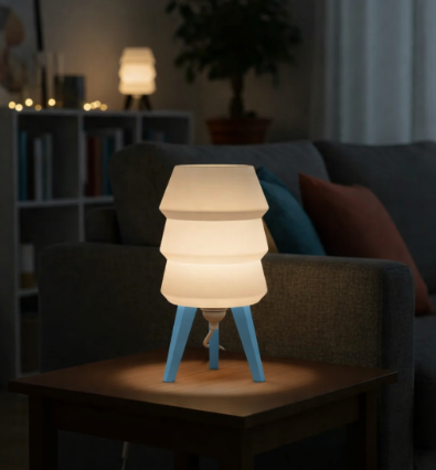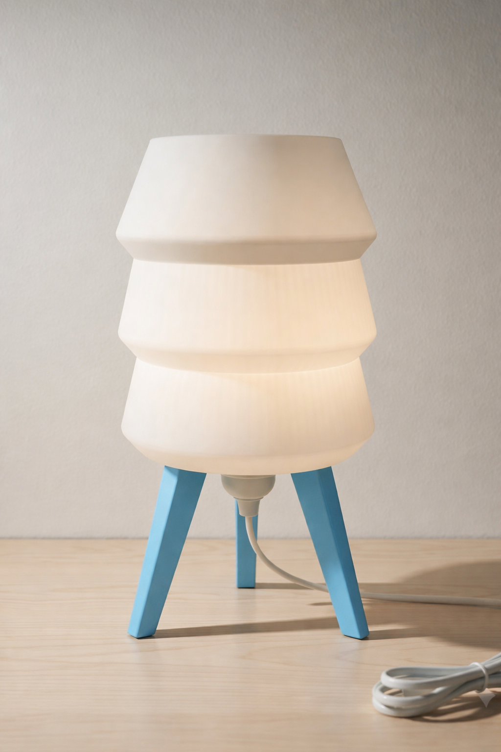 istedenfor svart bein som det var på den originale lampen, så bytte vi den med lyse blå fargen. Materiale: plast (PLA+) Farge: Hvit skjerm, Blå bein lyskilde: E27 sokkel (med pære) størrelse: høyde: 315, bredde: 160mm ledning: 3,5 lang med eurokontakt bruksområde: innendørs montering: hvis trengs (enkel montering)