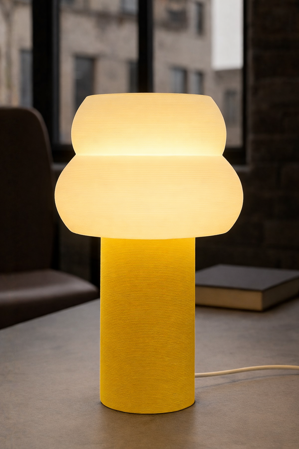 Materiale: plast (PLA+) Farge: Hvit skjerm, gult bein lyskilde: E27 sokkel (med pære) størrelse: høyde: 300, bredde: 200mm ledning: 3,5 lang med eurokontakt bruksområde: innendørs montering: hvis trengs (enkel montering)